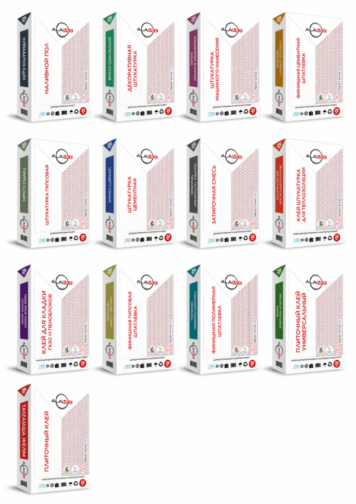 Клей плиточный «ALAMIX» — предназначен для облицовки оштукатуренных и бетонных стен керамической плиткой в сухих и влажных помещениях. Изготовлен на основе серого цемента. Подходит для внутренних и наружных работ.